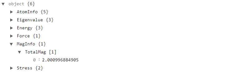 在 scf.h5 的 Eigenvalue - Spin - Occupation 部分可得向上自旋的电子占据数为4,向下自旋的电子占据数为2,从 MagInfo 部分可得总磁矩为 2μB ,同时在 DS-PAW.log 中也可读取体系的总磁矩为 2μB 。