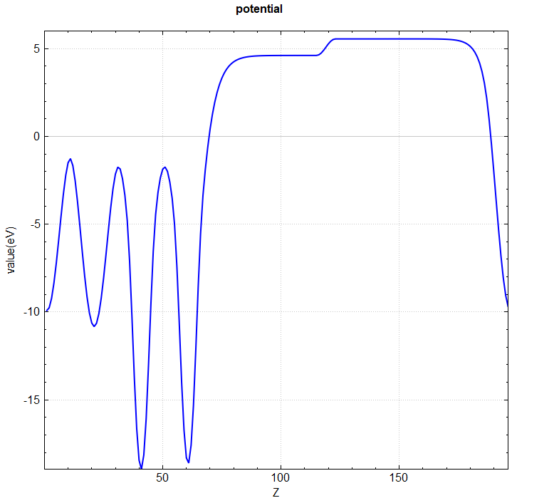 io.potentialis the switch for calculating the potential function in the self-consistent field (SCF) calculation;potential.typecontrols the type of potential function to be saved. The electrostatic potential data is needed when calculating the work function, and here we set potential.type = hartree;corr.dipolis the switch for dipole correction; set to true in this example;corr.dipolDirectionIn this example, the direction of the dipole correction is set to the c direction of the lattice vectors.