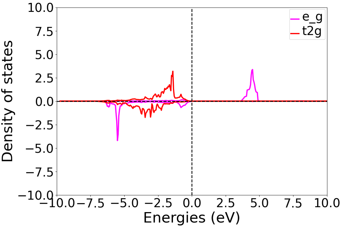 After the self-consistent field (SCF) and density of states (DOS) calculations are completed, the distribution of the t2g and eg orbital density of states for the second Ni atom after the DFT+U calculation is analyzed. The resulting distribution plot is shown below: