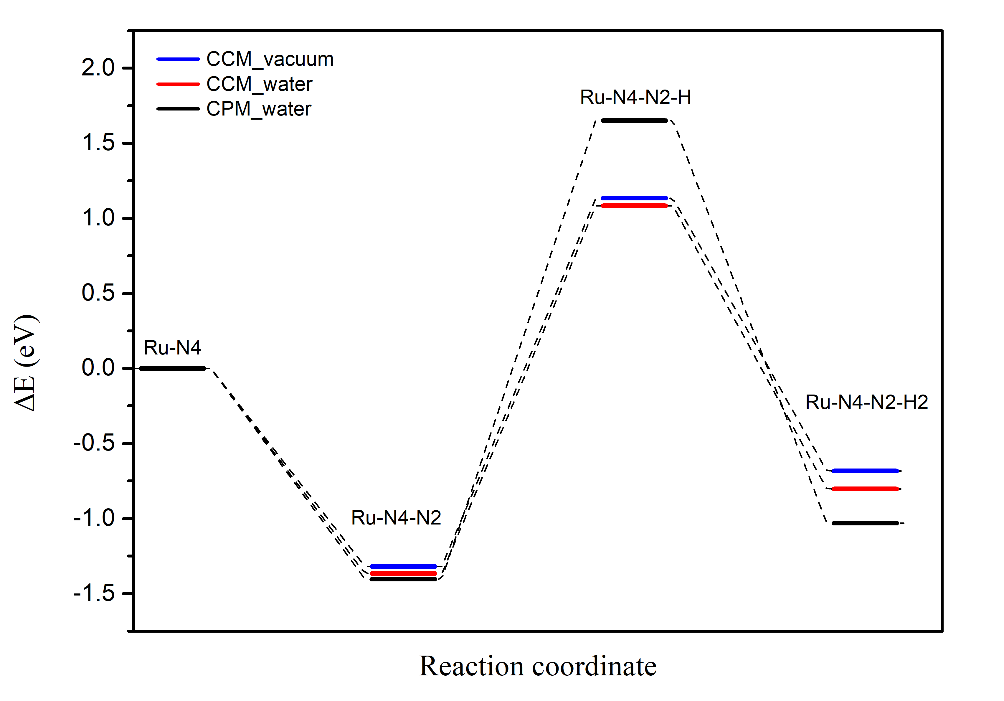 Substituting the data from Table 1 into the adsorption reaction equations for the CCM_vacuum, CCM_water, and CPM_water models, we calculate the reaction energies of the first three steps of the eNRR for the three models. The results are shown in Table 2: