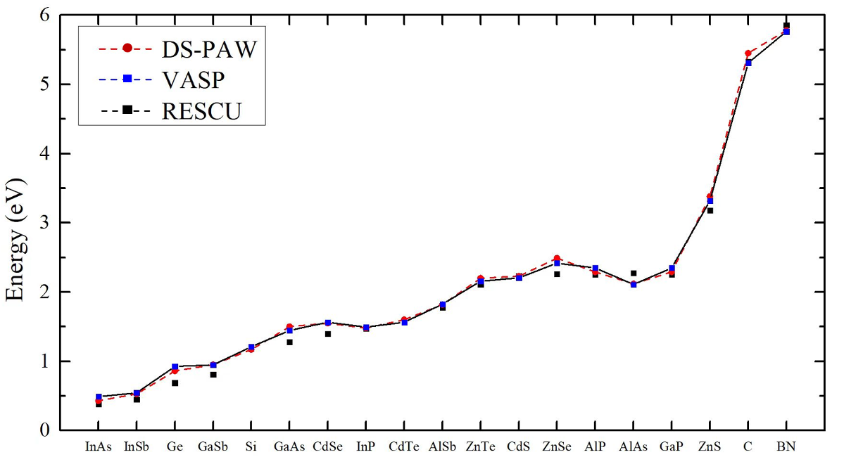 This section presents band gap calculations using HSE06 with version 1.0 pseudopotentials for multiple systems. The band gap values obtained are compared with those calculated using VASP and RESCU software, as reported in the literature, along with those from DS-PAW calculations. The resulting figure (shown below) further validates the accuracy of the hzw pseudopotentials.