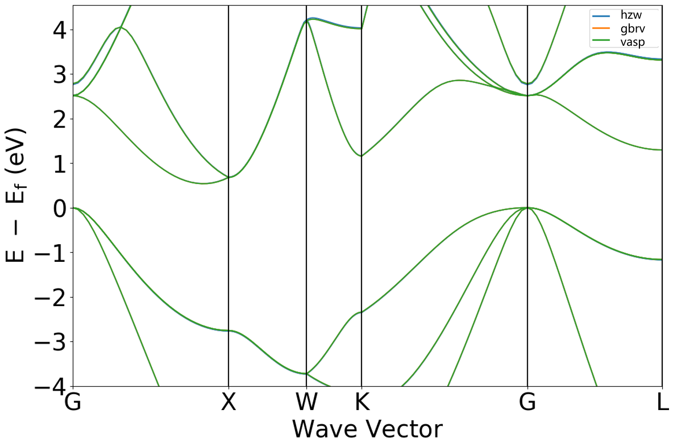 为对比三种赝势的计算结果,本节以Si体系为例,分别使用以上三种赝势进行了能带计算,下图为能带对比图,该对比图说明三种赝势在描述Si的能带时,体系出较高的一致性,验证了hzw赝势的准确性。