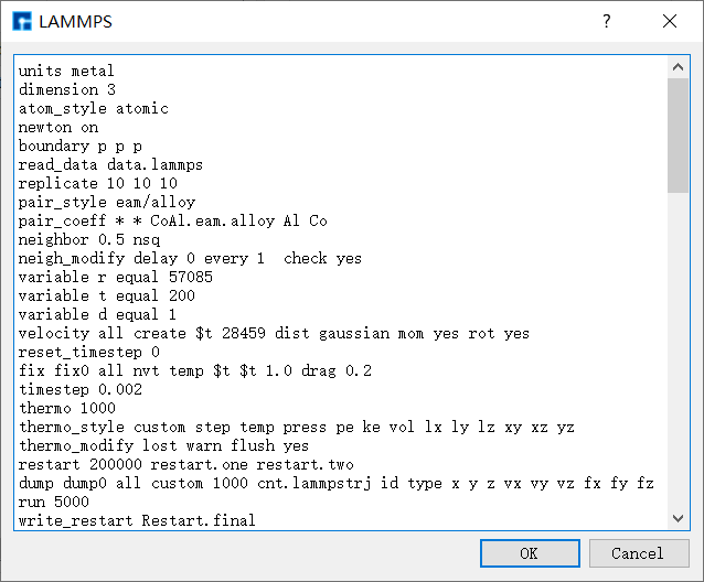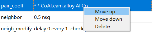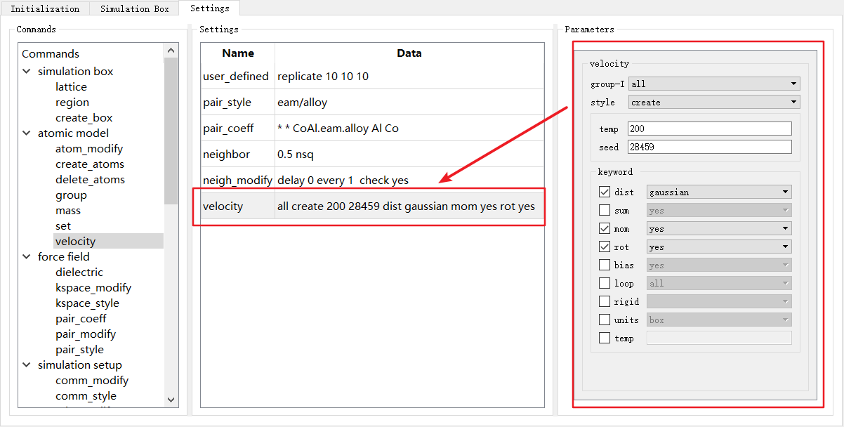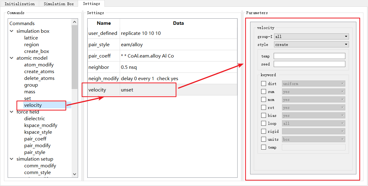 LAMMPS不同的命令的参数不同,因此选择不同命令时, Parameters 也对应发生变化。