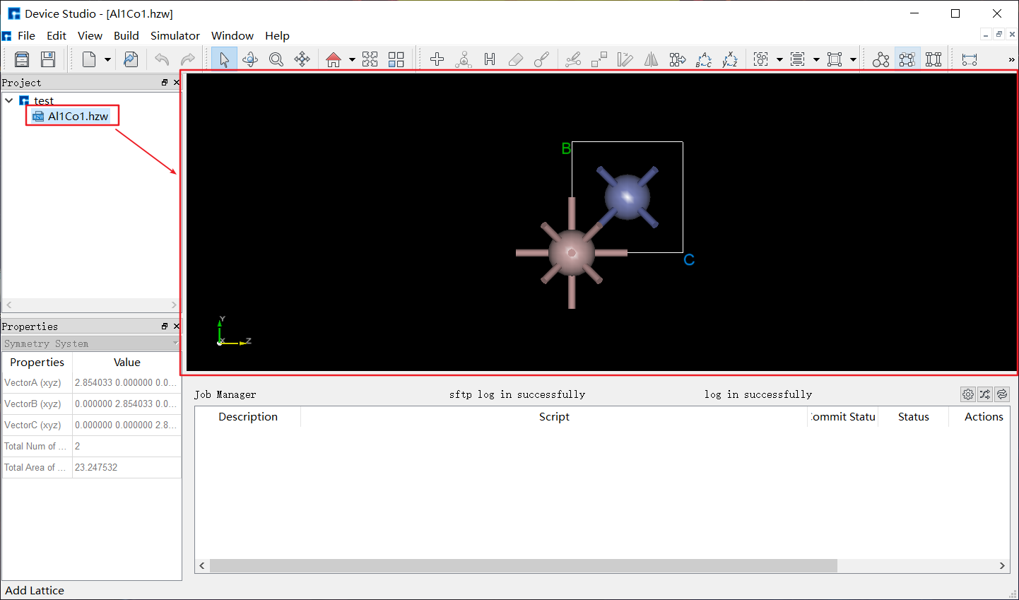 LAMMPS中有三种定义原子的方式,从data或restart文件中读取、使用lattice, region, create_box, create_atoms命令在晶格上创建原子、使用replicate命令复制原子以生成更大的体系。简单地说,一种是依靠命令创建,一种是从其他文件导入。目前,软件在导入结构后才能使用界面设置参数。如图4-2-2,选择菜单栏 File 下的 Import ,选中结构文件并导入,支持 *.hzw 、 *.cif 、 *.xyz 、 POSCAR 等多种格式,同时在图形界面显示该结构,如图4-2-3所示。