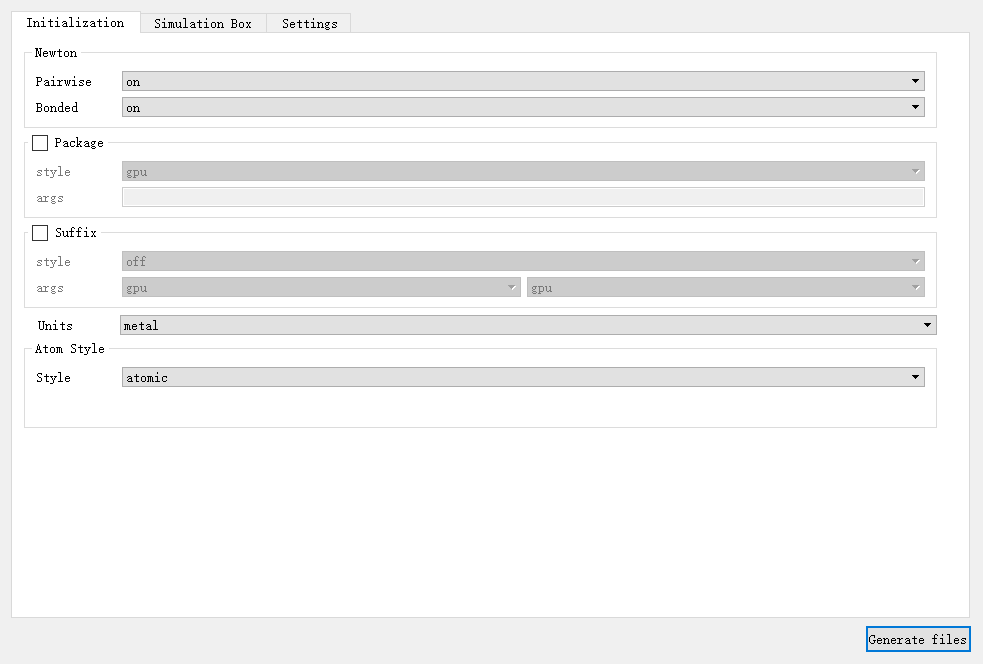 在 initialization 选项卡中对与初始化相关的基本参数进行修改,如图4-2-4所示,包括设置开启或关闭牛顿第三定律的 Newton 、对特定加速包设置的 Package 、后缀 Suffix 、模拟的单位 Units 、设置使用哪种类型的原子 Atom_Style 。其中, Package 、 Suffix 默认不设置,也可以勾选进行相关设置,其余参数必须进行设置。