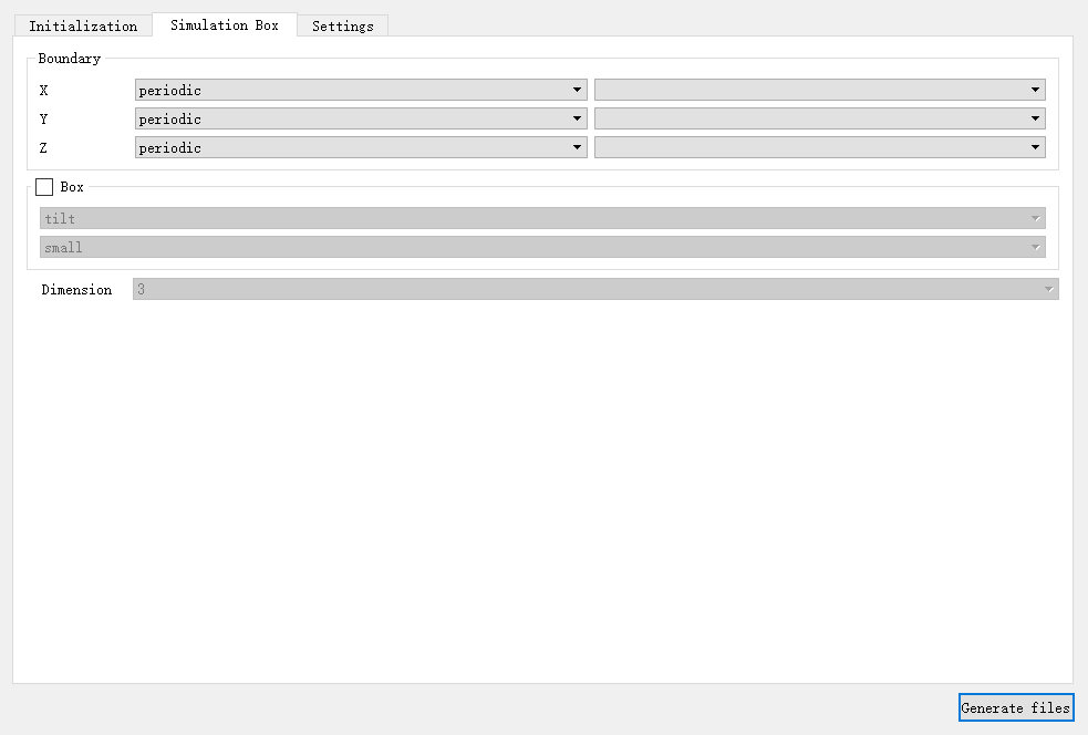 在 Simulation box 选项卡中对与模拟盒子相关的基本参数进行修改,如图4-2-5所示,包括设置三个方向边界条件的 Boundary 、模拟盒子属性的 Box 、模拟维度的 Dimension 。其中, Box 默认不设置,也可以勾选进行相关设置,其余参数必须进行设置。