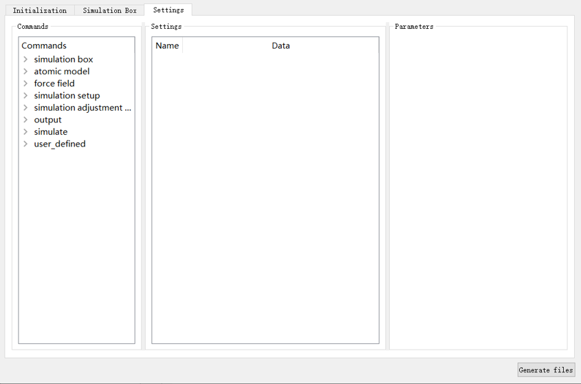 由于LAMMPS在同一个输入脚本中可以采用多条相同的命令在不同的位置、进行不同参数的设置,因此完成基本参数设置后,选择 Settings 选项卡,如图4-2-6所示,分为 Commands 、 Settings 、 Parameters 三个部分。