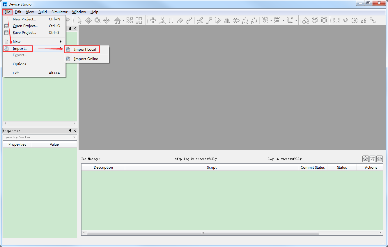 Device Studio支持在线数据库Materials Project,如图3-5红色部分所示:点击 File → Import → Import Online 则弹出从Materials Project数据库导入结构的界面,在该界面中用户可通过输入元素、化学式或mp序号的方式来搜索原子结构。