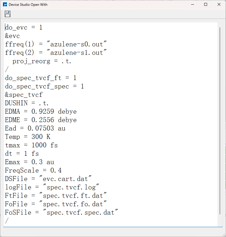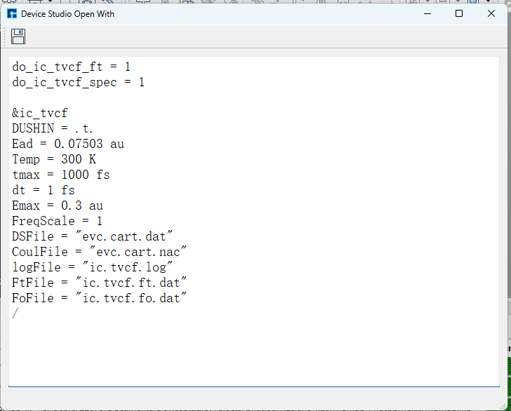 考 Nanodcal连接服务器 节内容。连接好装有BDF的服务器,在做计算之前,用户可根据需要打开输入文件并查看文件中的参数设置是否合理,若不合理,则可选择直接在文件中编辑或重新生成,最后再进行BDF计算(这里BDF计算指 基态分子CH2S完成sf-X2C/TDDFT-SOC的自旋轨道耦合计算 )。如打开 bdf.inp 文件,在Device Studio的Project Explorer区域选中 bdf.inp → 右击 → Open with 即可查看到 bdf.inp 文件如下所示。