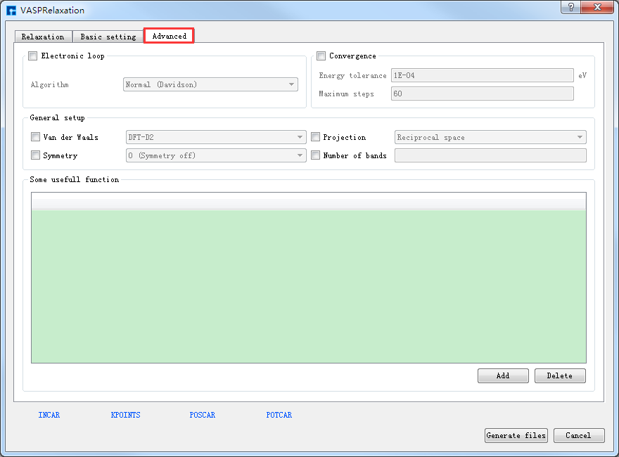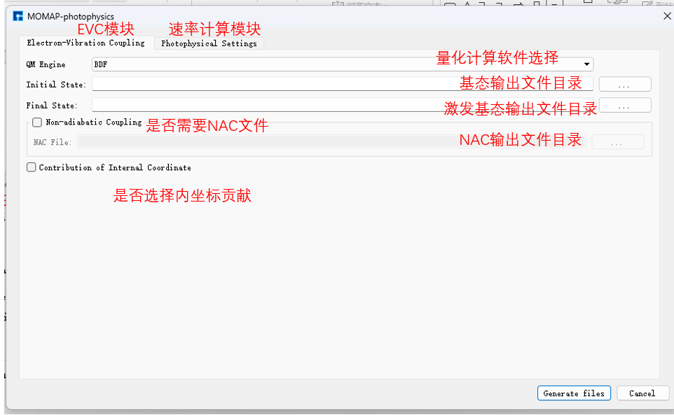 分别如 图 10.112 、 图 10.113 、 图 10.114 和 图 10.115 所示,之后点击界面中的 Generate files 即可生成输入文件 bdf.inp。
