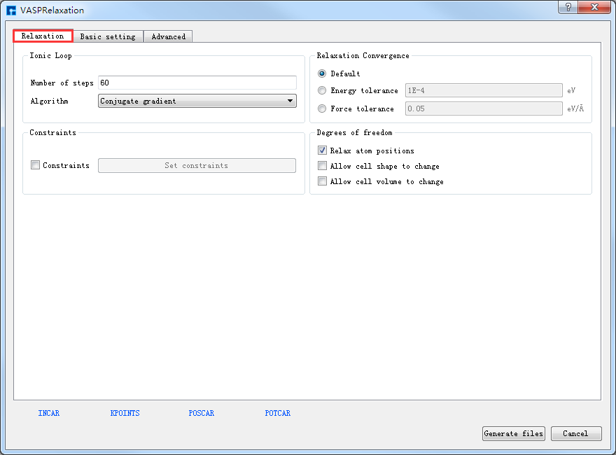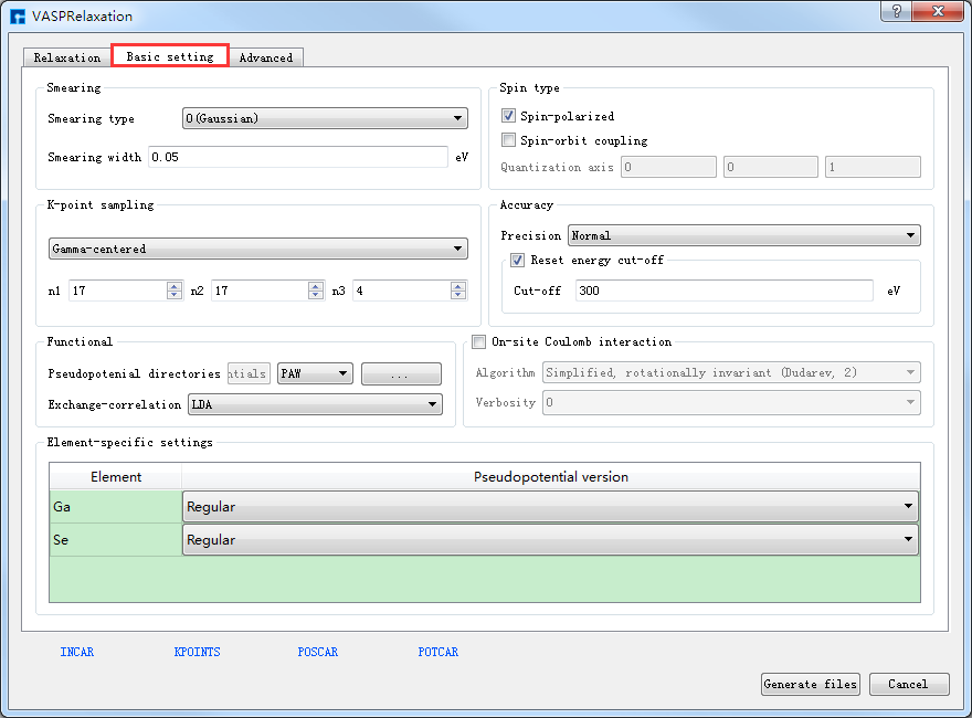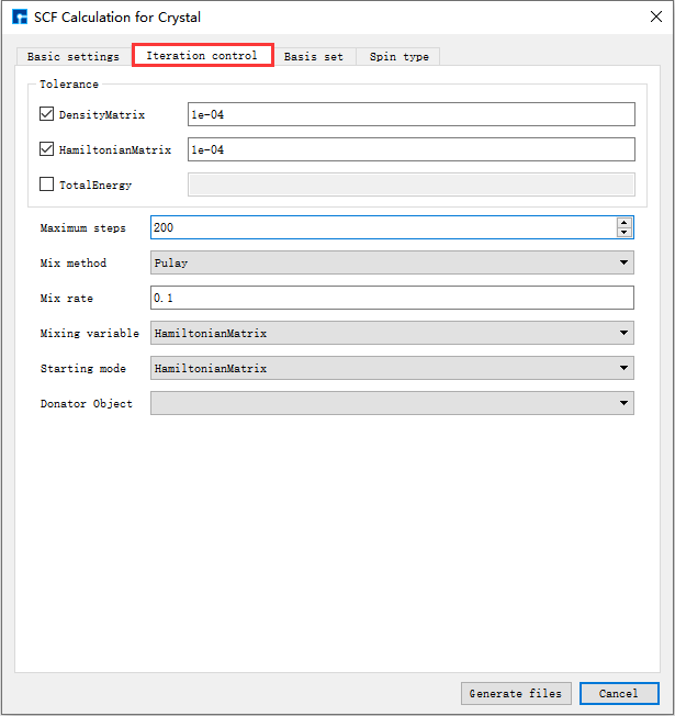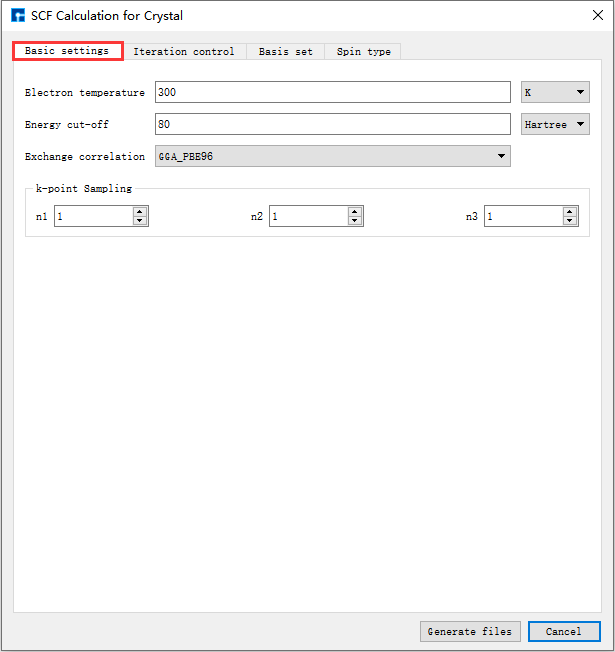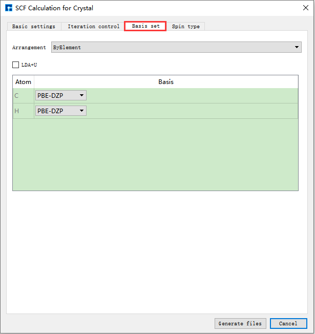如生成Benzene分子自洽计算输入文件,根据计算需要设置参数,分别选中 Basic settings 、Iteration control、Basis set、Spin type 设置参数分别如 图 10.4 、 图 10.5 、 图 10.6 和 图 10.7 所示,设置好参数后点击 Generate files 即可生成Benzene自洽计算输入文件 scf.input。