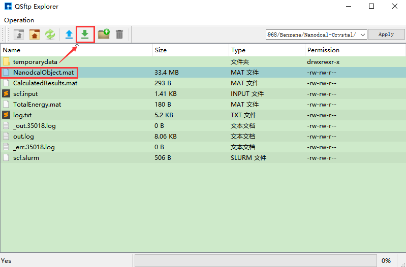 计算中和计算完成时,Status 分别为Queued、Running、Finished。计算完成后,点击Job Manager区域的Actions按钮,则弹出Qsftp Explorer界面,在该界面中,找到计算结果文件,点击 下载 按钮即可将计算结果文件从服务器下载到本地,下载后的结果文件可在Device Studio的Project Explorer区域查看到。