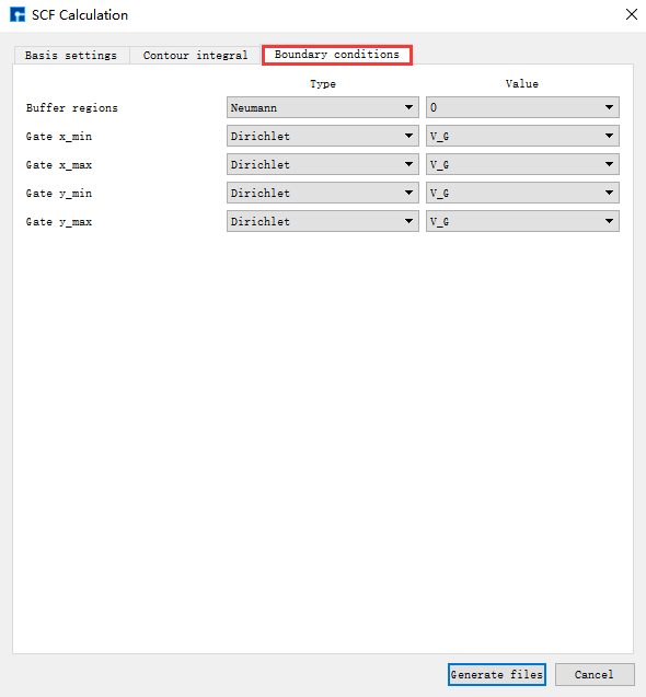 在如 图 10.3 所示界面中选中 Simulator → Nanodcal → SCF Calculation,弹出界面如 图 10.4 所示,用户可根据所计算的结构及计算需要分别选中 Basic settings 、Iteration control、Basis set、Spin type 这四个按钮合理设置参数,之后点击 Generate files 即可生成自洽计算输入文件。