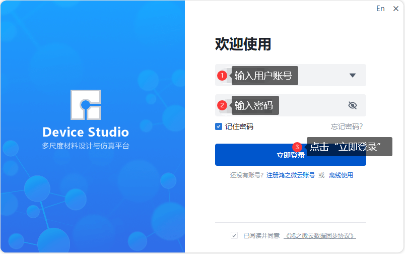 使用Device Studio的方式有2种,使用鸿之微云账号登录使用或离线使用,建议用户使用 鸿之微云账号登录使用 ,下面将详细描述使用使用鸿之微云账号登录使用Device Studio的操作步骤: