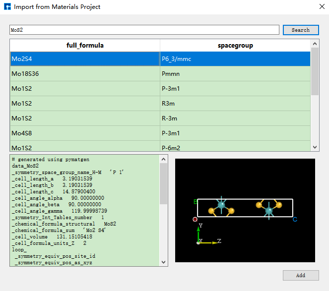 Device Studio平台支持在线数据库Materials Project,用户可通过Device Studio平台连接该数据库搜索并导入结构,并可查看结构的空间群对称和原子坐标等信息。